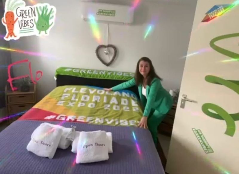 Toen B&B-eigenaar Milly Breton van Groll voorheen bij VVV Almere werkte, merkte ze daar dat er veel vraag naar bed & breakfast-overnachtingen was. Hier is ze slim op ingesprongen met haar B&B Open Doors in Almere-Stad. Op de coronatijd na heeft ze het al jaren lekker druk met boekingen. Zeker tijdens de Floriade, nu er veel Duitsers en Engelsen kamers boeken en veel gasten zelfs voor hele weken inchecken. De vlaggen, wimpels en stickers uit de #GreenVibes-toolkit vallen goed in de smaak bij de gasten, die daardoor al bij aankomst helemaal in de Floriade-mood komen.