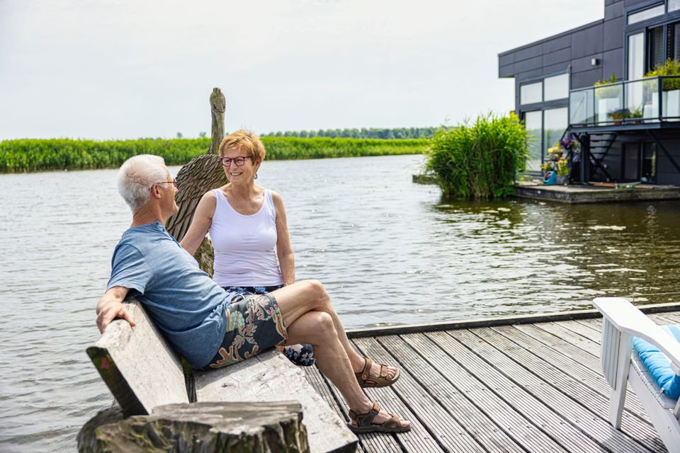 Midden in de natuur. Verscholen tussen het groen. In de nieuwbouwwijk Warande, aan de zuidrand van Lelystad, liggen in totaal acht drijvende woningen aan de Torenvalktocht. In één van deze woningen wonen Rien de Kloet en Marianne Kramer die nog iedere dag het vakantiegevoel ervaren.